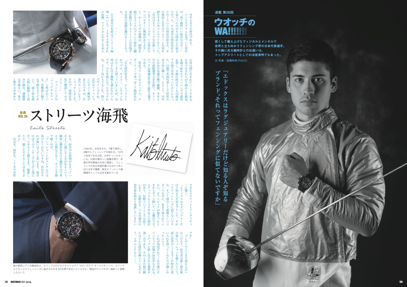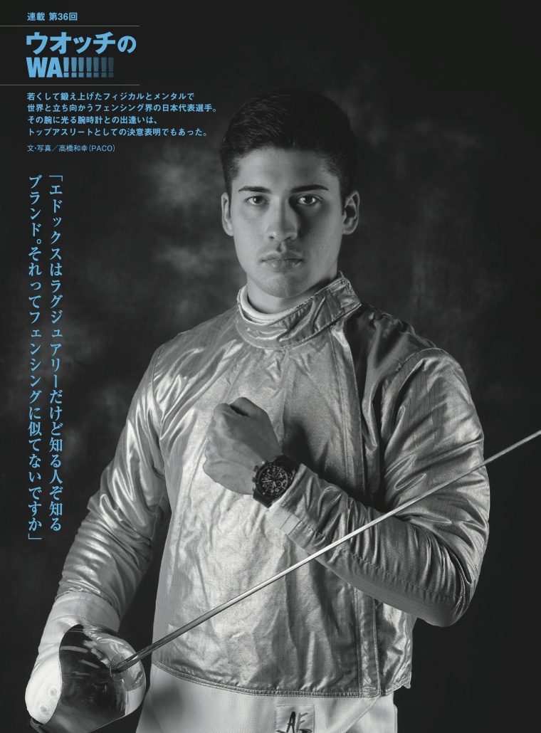 各界の第一線で活躍する著名人へのインタビューによる連載コラム“エドックス ラヴァーズ”。プロフェッショナルな仕事へのこだわりや、彼らの愛用ウォッチなどに迫ります。今回は、2017、2019年全日本選手権で2度優勝するなどの活躍で、日本フェンシング界を牽引する五輪代表候補、ストリーツ海飛さん。米国人の父と日本人の母の元に日本で生まれ、米国でフェンシングを学び、ペンシルバニア州立大学卒業後、日本へ帰国。母のルーツである日本を代表する選手として、研鑽に励む真摯な姿は、エクストリームそのもの。そんな彼のアスリートライフを”Urban Divers“=クロノオフショア1と共に迫ります。